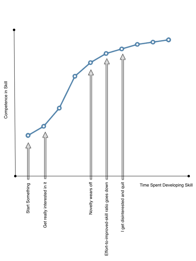 This graph depicts most things that I get involved with. I start by picking something up naturally and I get lots of reward for putting effort into improving my skill. As a teenager, acquiring new skills was considered industrious and laudable, so I started to pursue lots of different ways to spend my time. Usually, however, I'd eventually lose interest; I haven't seriously played any music since graduating from High School.