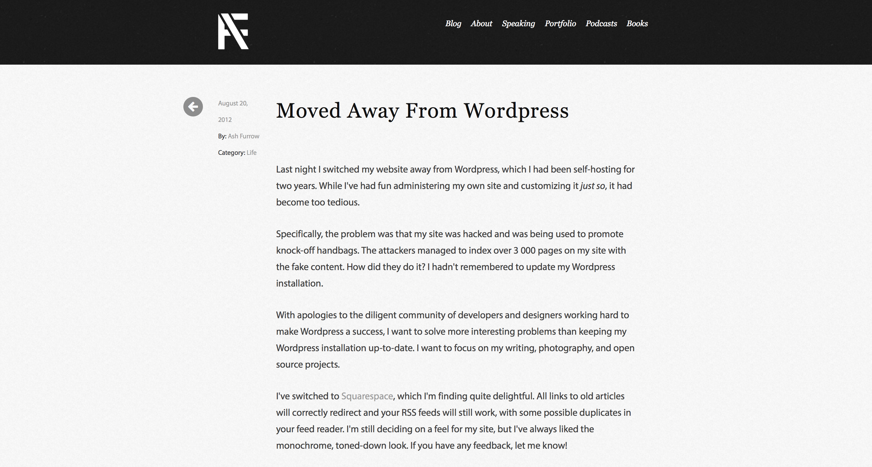 Until one day, my site got hacked. It sucked, having your name on pages selling knock-off handbags. I needed a new site that could import my old posts. I chose Squarespace for a few reasons: it was easy and let me write in markdown, it let me focus on writing instead of design and upkeep (which I was still afraid of), and it would let me – at any point – export all my content.