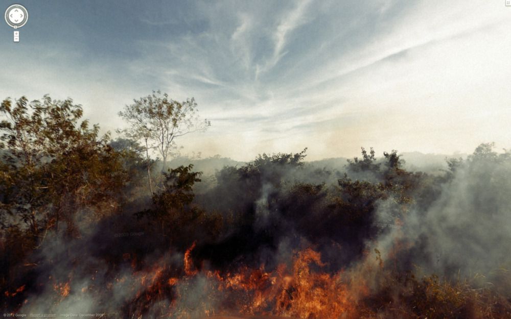 This is crazy - the Google Street View van just happened to catch a field fire in progress. If someone hadn't have gone looking for this, no one would have captured this really interesting moment in time.