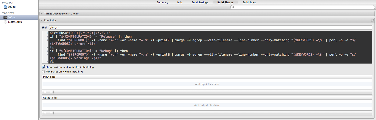 find "${SRCROOT}" \( -name "*.h" -or -name "*.m" \) -print0 | xargs -0 egrep --with-filename --line-number --only-matching "($KEYWORDS).*\$" | perl -p -e "s/($KEYWORDS)/ error: \$1/"