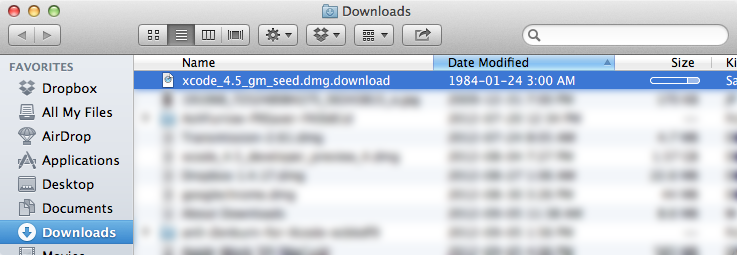 I was downloading the new iOS 6 SDK today, which takes a while. I wanted to check out the state of the download, and sorted my Downloads folder by "Date Modified." The download, which was still in progress, looked like the following: