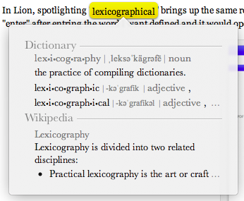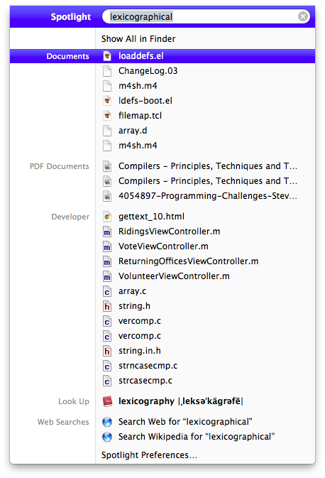 When I'm at work, I still use Snow Leopard (for a number of legitimate reasons). When I come home, I use Lion. And it's a little jarring. Just like when iPhone OS 3 came out and introduced spotlight and when I used someone else's iPod Touch with iPhone OS 2, it wasn't there. When my established workflow changes, it bothers me. In Snow Leopard and all previous versions of OS X with spotlight, search for a word like "lexicographical" would bring up (at the top) a dictionary entry for the word, followed by any documents, emails, and browser history with that word in it.