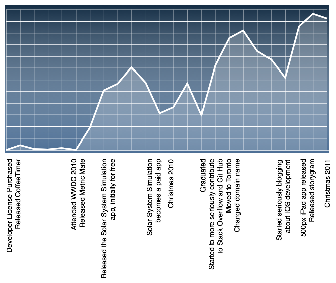 I've annotated it to include events that I feel affected (or rather, effected) sales of my apps. Having popular free apps helped, initially, but I've found in the long run, selling the Solar System Simulator for $3 nets more than releasing it for free and getting incidental traffic from the App Store. The prices of my apps have also fluctuated as I experimented. I have tried several different ad campaigns, but none of them seemed effective, so I'm not labeling them.