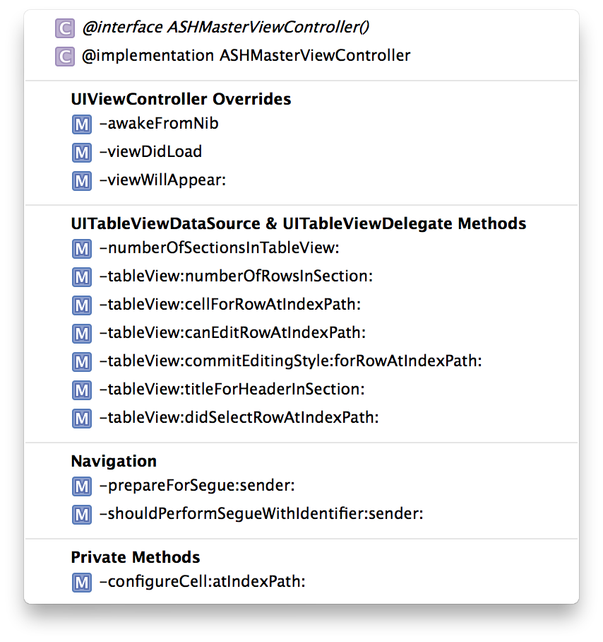 , followed by protocol names in order to divide my code. Because I have the actual name of the protocol, I can ⌘-click on that name to immediately jump to the protocol definition. I also use it to separate out my private and public methods, which helps my sanity.